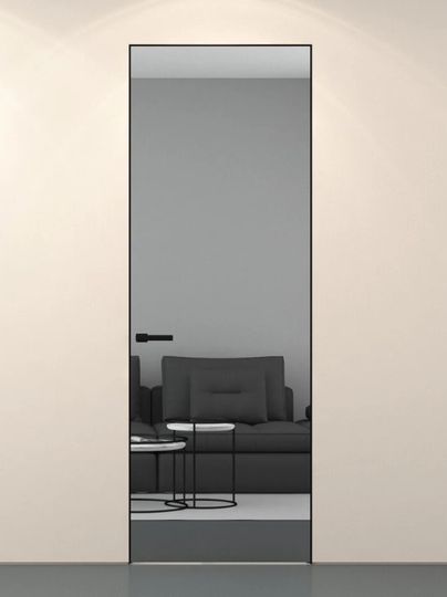Каркасная дверь Hausdoors с зеркалом на лицевой части, с другой стороны под покраску, открывание наружу. Полотна изготавливаются с фабричной фрезеровкой под замок 196 мм и петли AGB Eclipse 2.2. Со стороны зеркала предусмотрено одно или два отверстия - под ручку и фиксатор/цилиндр. Рекомендуется к установке ручка на круглой розетке диаметром не менее 52 мм.