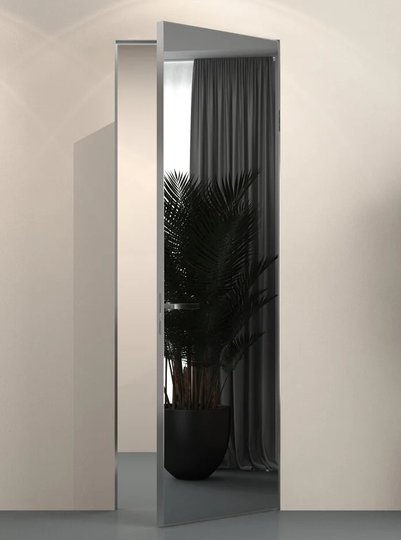 Каркасная дверь Hausdoors с зеркалом на лицевой части, с другой стороны под покраску, открывание наружу. Полотна изготавливаются с фабричной фрезеровкой под замок 196 мм и петли AGB Eclipse 2.2. Со стороны зеркала предусмотрено одно или два отверстия - под ручку и фиксатор/цилиндр. Рекомендуется к установке ручка на круглой розетке диаметром не менее 52 мм.