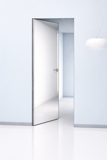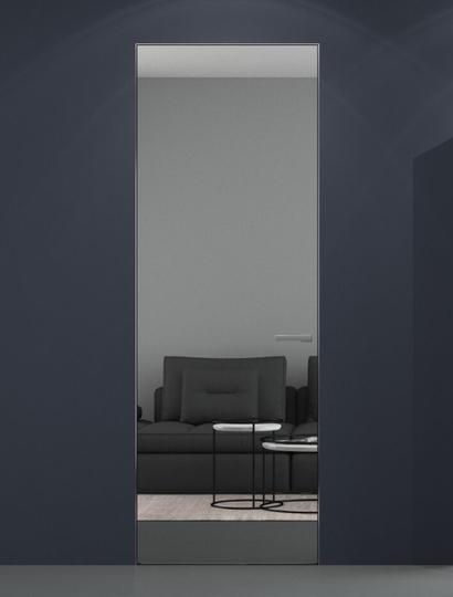 Каркасная дверь Hausdoors с зеркалом на лицевой части, с другой стороны под покраску, открывание внутрь. Полотна изготавливаются с фабричной фрезеровкой под замок 196 мм и петли AGB Eclipse 2.2. Со стороны зеркала предусмотрено одно или два отверстия - под ручку и фиксатор/цилиндр. Рекомендуется к установке ручка на круглой розетке диаметром не менее 52 мм.
