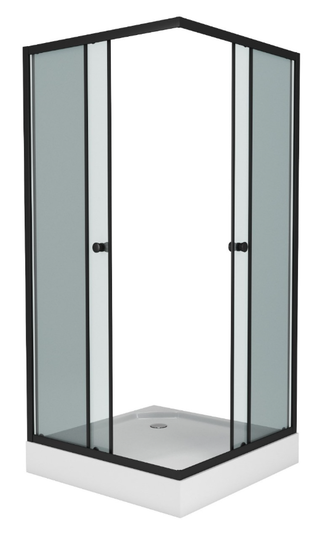 низкий поддон 13 см, алюминиевые профили, раздвижные шторки с роликовым механизмом, черные ручки