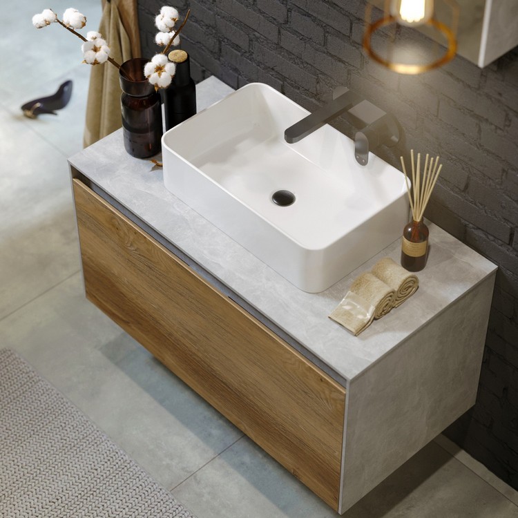 Тумба Mobi 60 оснащена двумя ящиками: основным и внутренним, скрытым за фасадом. Направляющие ящиков обеспечивают плавное и мягкое закрывание. Внутренний ящик тумб укомплектован пластиковым разделителем для хранения различных мелочей. Внутренняя отделка ящиков комбинированная: боковины – цвет бетон светлый, дно – дуб балтийский. В комплект тумбы Mobi входит специальный сифон, позволяющий экономить пространство мебели. Фасады, боковины и столешницы из МДФ толщиной всего 10 мм. Подходит любой наставной умывальник. При этом умывальник может устанавливаться в любом месте, а не только центру. Коллекция оснащена итальянскими навесами Camar, которые выдерживают нагрузку до 200 кг.