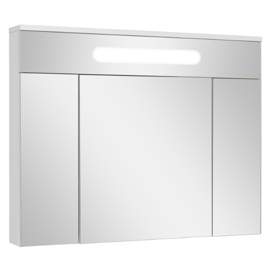 Зеркало-шкаф Olivia 100 оснащен тремя распашными зеркальными дверцами. Блок розетка/выключатель расположен внутри шкафа. Полки под хранение обеспечивают порядок внутри. Петли на дверцах со встроенным доводчиком.
