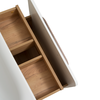 Тумба Skandi 80 оснащена двумя ящиками: внешним и внутренним. Внешний ящик на направляющих скрытого монтажа с доводчиком. Внутренний открывается с помощью механизма Push-to-Open. Корпус тумбы выполнен из ЛДСП в древесной текстуре "дуб крафт золотой", а фасад внешнего ящика - из МДФ в белой глянцевой эмали. Лаконичным завершением общей композиции является стильная хромированная ручка.