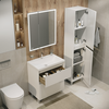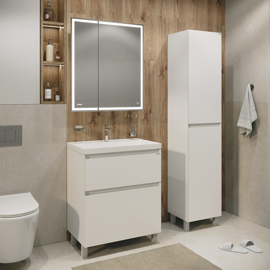 Тумба Меркадо 60 - стильное и функциональное решение для интерьеров в скандинавском и современном стиле. Корпус и фасады выполнены из МДФ в белой матовой краске. Фасады с точным запилом под 45° на торцах, что исключает видимую кромку и позволяет обходиться без ручек, создавая лаконичный и минималистичный дизайн. Два вместительных ящика изготовлены из ЛДСП «Дуб Эльвезия» и оснащены направляющими скрытого монтажа с доводчиком, обеспечивающими плавное и бесшумное закрывание. Тумба установлена на хромированные ножки высотой 10 см, а для надежного крепления предусмотрены подвесы в комплекте.