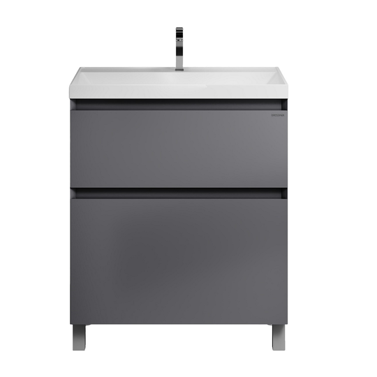 Тумба Меркадо 70 - стильное и функциональное решение для интерьеров в скандинавском и современном стиле. Корпус и фасады выполнены из МДФ в графитовой матовой краске. Фасады с точным запилом под 45° на торцах, что исключает видимую кромку и позволяет обходиться без ручек, создавая лаконичный и минималистичный дизайн. Два вместительных ящика изготовлены из ЛДСП «Дуб Эльвезия» и оснащены направляющими скрытого монтажа с доводчиком, обеспечивающими плавное и бесшумное закрывание. Тумба установлена на хромированные ножки высотой 10 см, а для надежного крепления предусмотрены подвесы в комплекте.